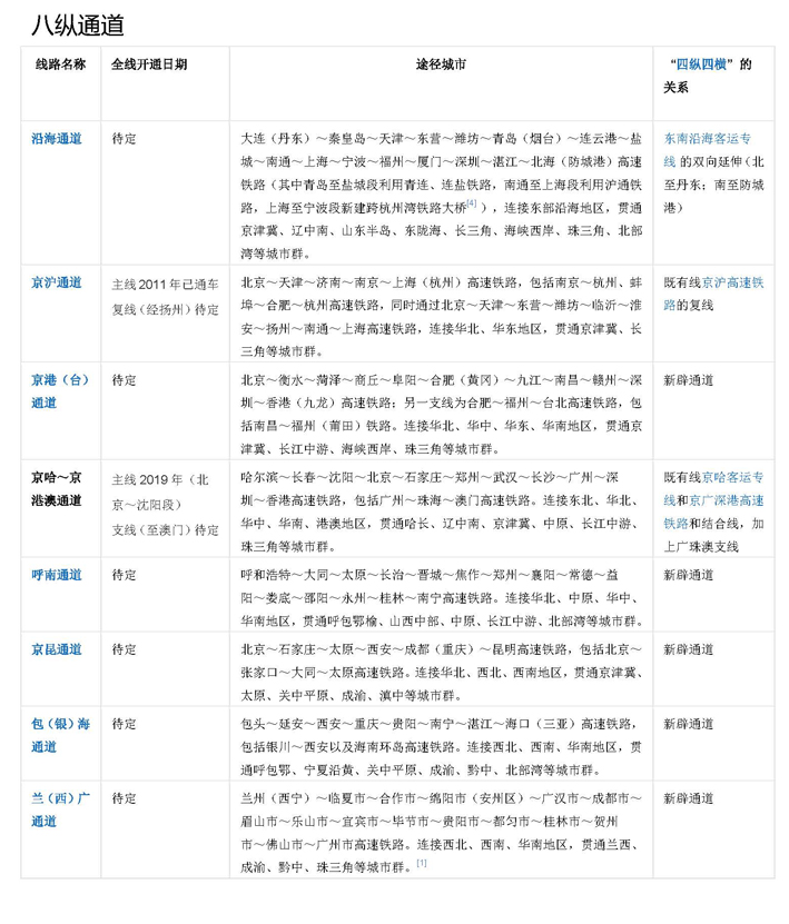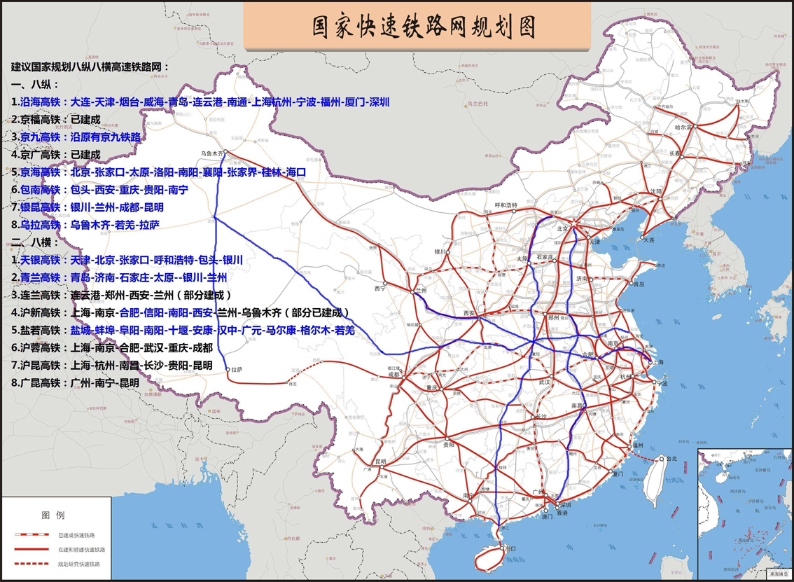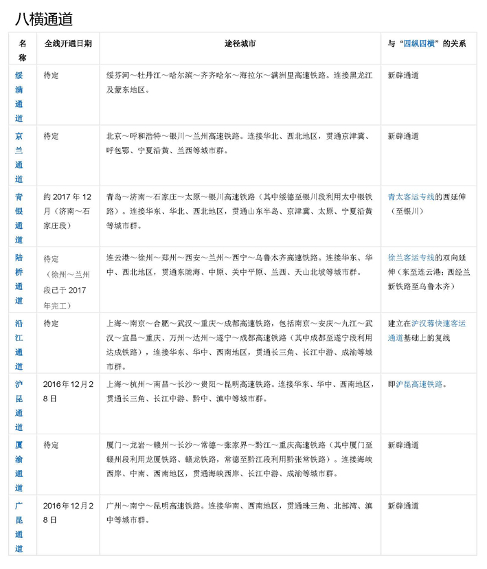 "八縱八橫" 是中國高速鐵路網(wǎng)絡(luò)的短期規(guī)劃圖。2016年7月,國家發(fā)展改革委、交通運(yùn)輸部、中國鐵路總公司聯(lián)合發(fā)布了《中長期鐵路網(wǎng)規(guī)劃》,勾畫了新時(shí)期“八縱八橫”高速鐵路網(wǎng)的宏大藍(lán)圖。 “八縱”通道包括沿海通道、京滬通道、京港(臺(tái))通道、京哈~京港澳通道、呼南通道、京昆通道、包(銀)海通道、蘭(西)廣通道。“八橫”通道包括綏滿通道、京蘭通道、福銀通道、青銀通道、陸橋通道、沿江通道、滬昆通道、廈渝通道、廣昆通道。